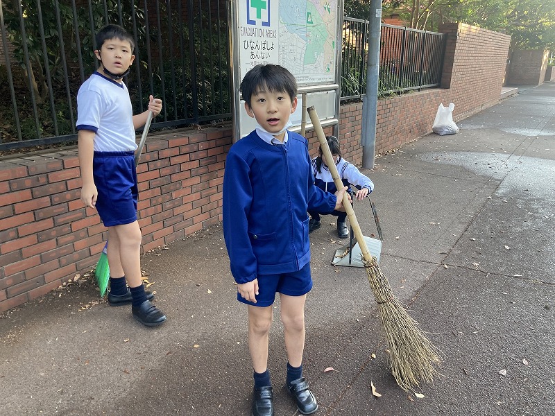 児童たちは登校後、自主的にホウキやちりとりを持ち、正門周辺の落ち葉を丁寧に掃き集めます。作業を通して体を動かすことで体がポカポカと温まるとともに、「みんなのために」という奉仕の精神を発揮することで、心も温まる「あったかハート」が育まれています。