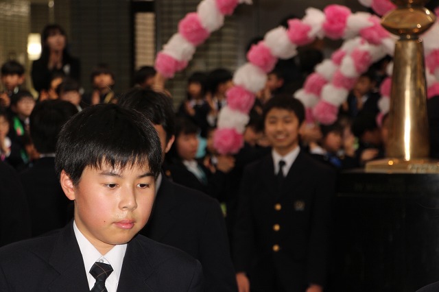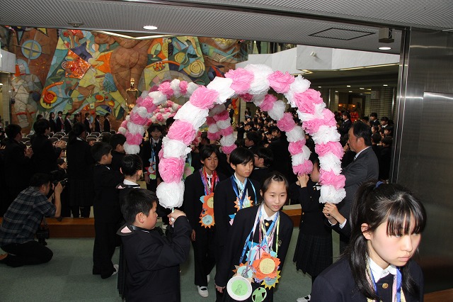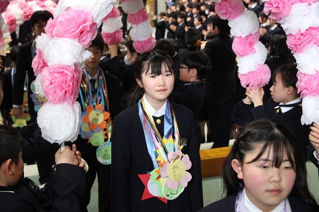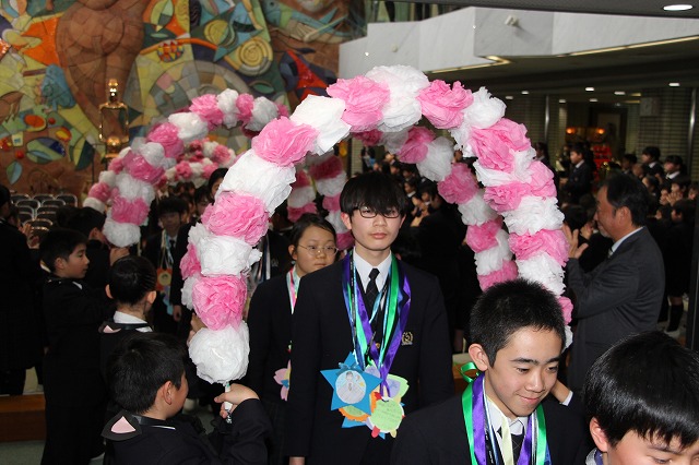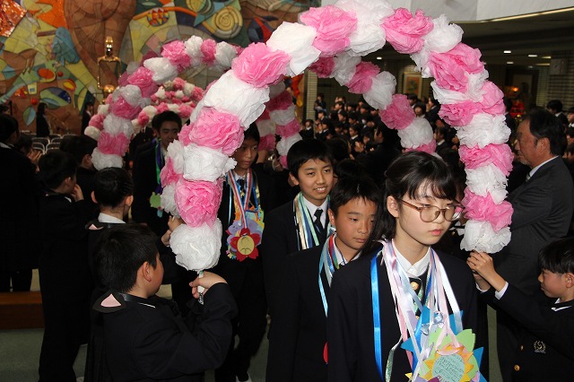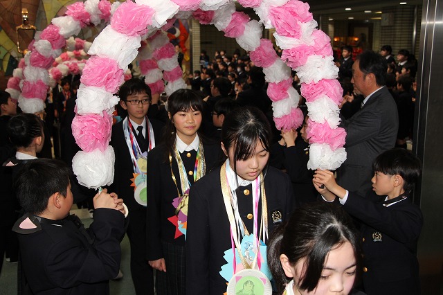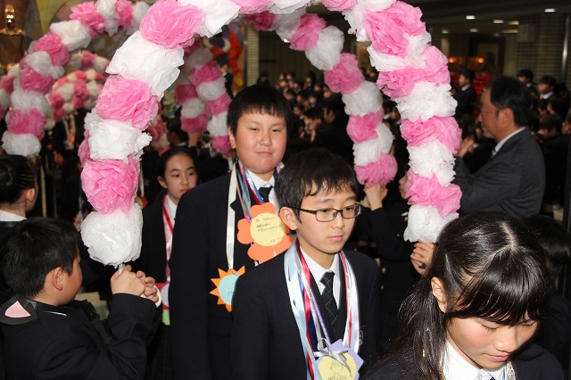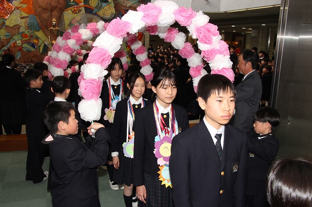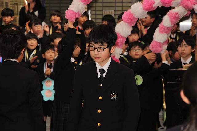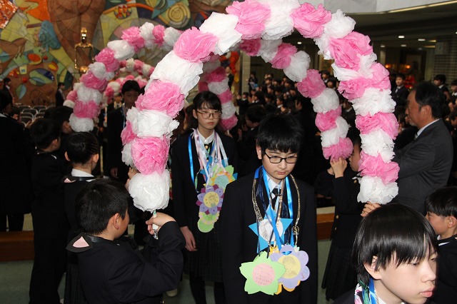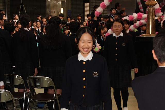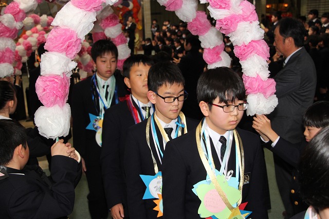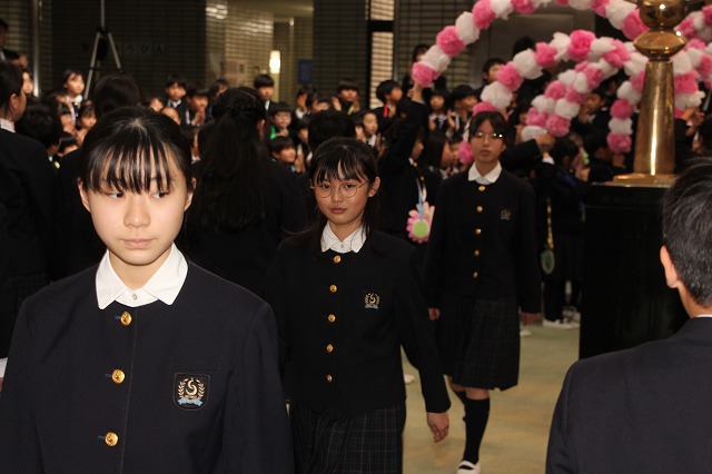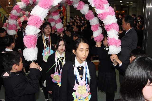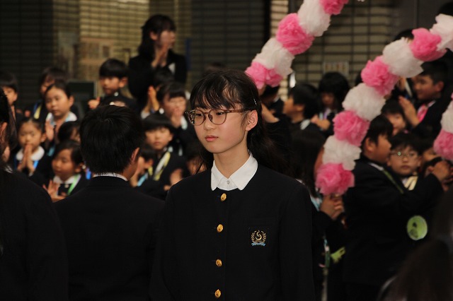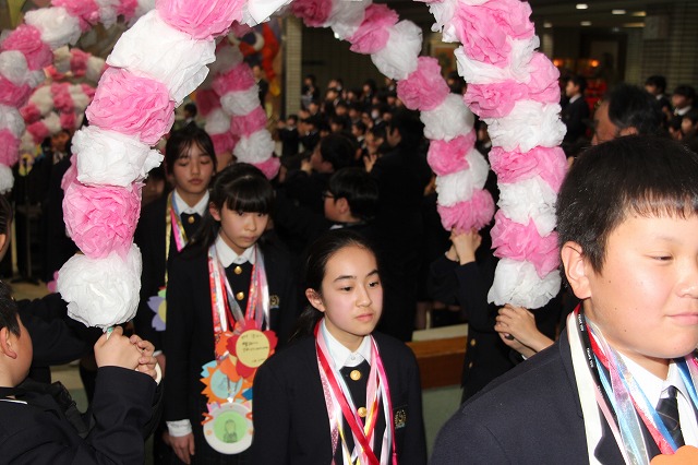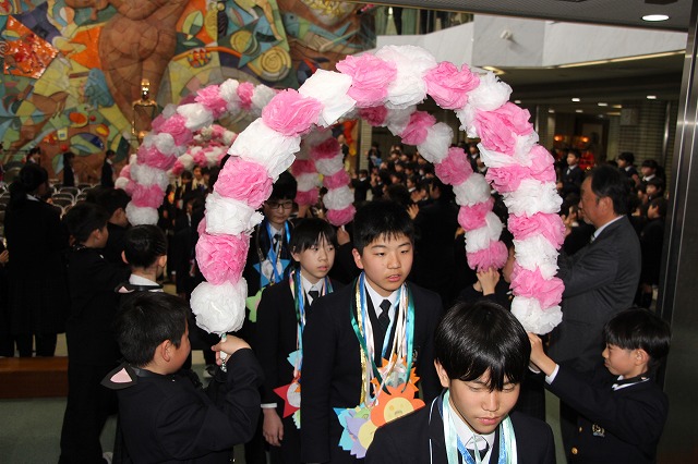 アーチ係がつくった花のアーチの中を、6年生が晴れやかな表情で入場し、会場は温かな拍手に包まれました。行進曲「アイーダ」が流れる中、1年間学校の中心として活躍してきた6年生を全校で歓迎しました。