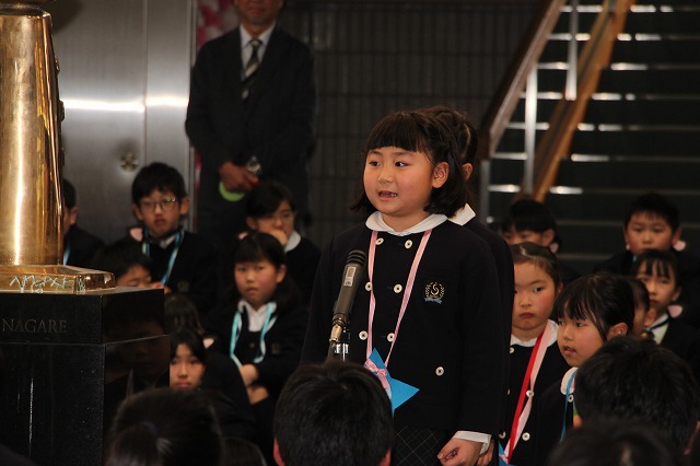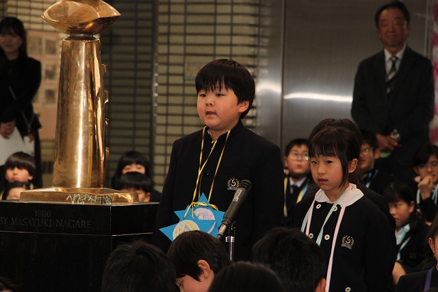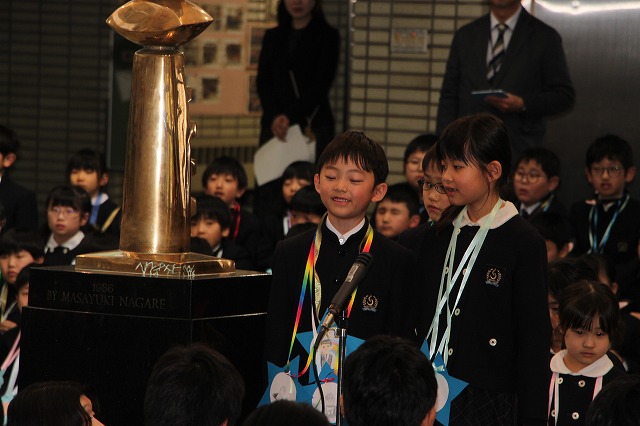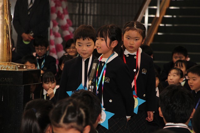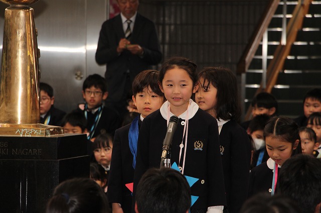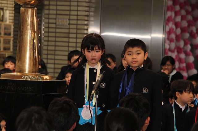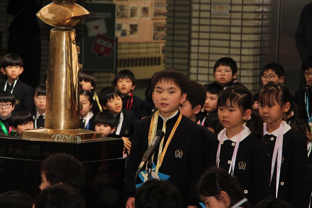 新明和会会長の児童が、在校生を代表して6年生への感謝の言葉を述べました。