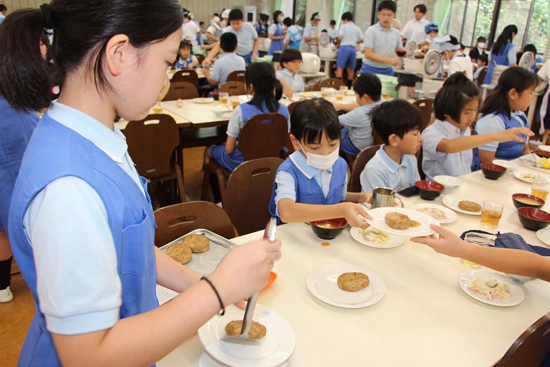 食堂(じきどう)の中が、なんだかとても楽しい雰囲気…それもそのはず、今日の会食は、子どもたちが大好きな「和風おろしハンバーグ」です。おかずを温かいまま提供できる「温カート」から取り出されたハンバーグが、子どもたちの手により、手際よく配膳されていきました。