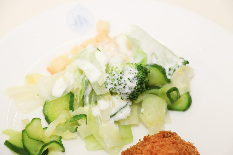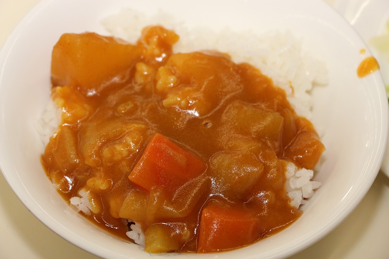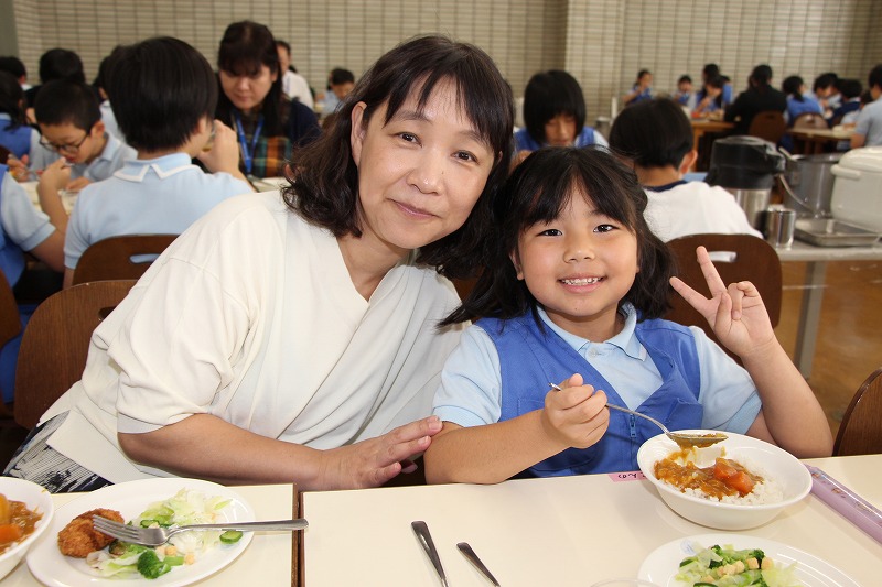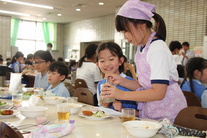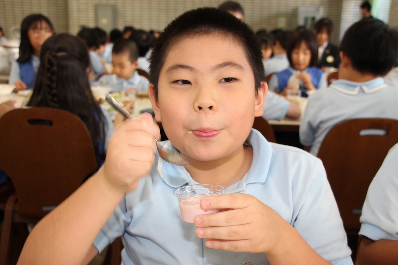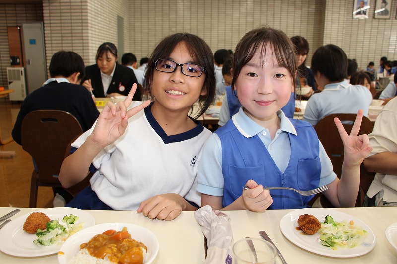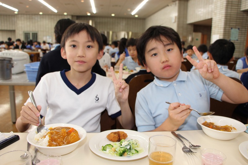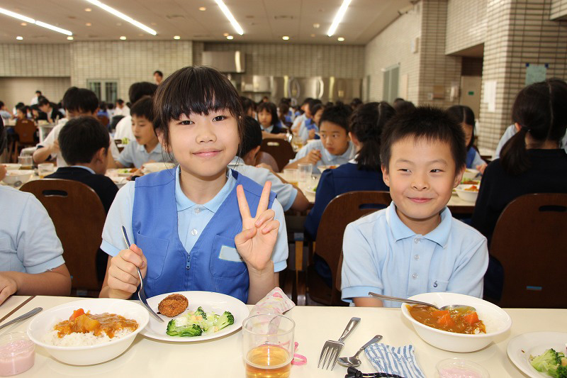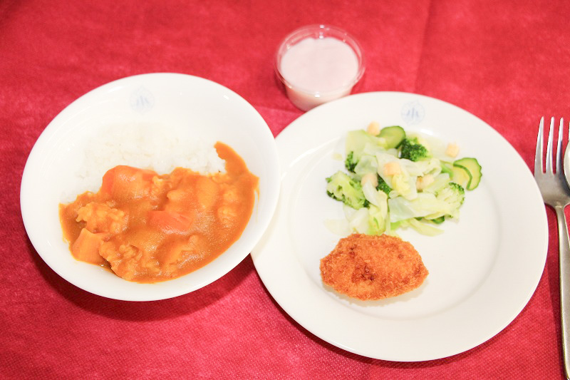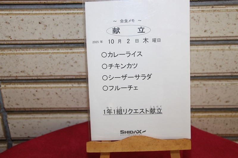 今日の食堂(じきどう)も、なんだか楽しい雰囲気にあふれていました。それもそのはず、1年1組のみなさんが考えた「リクエスト献立」だったからです。メインディッシュは「カレーライス」と「チキンカツ」。その脇を固めるのは「シーザーサラダ」と「フルーチェ」です。