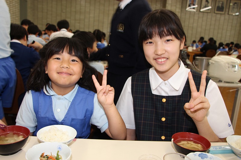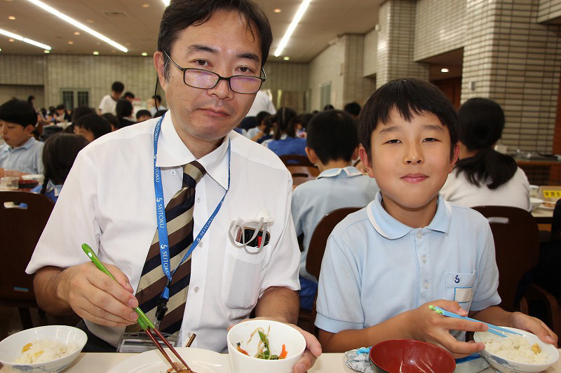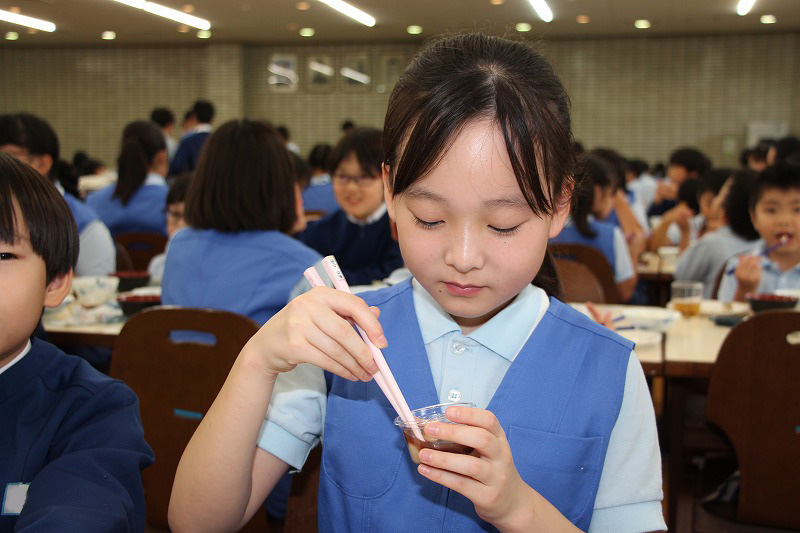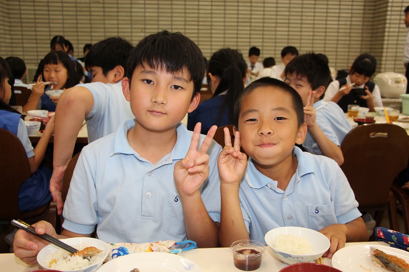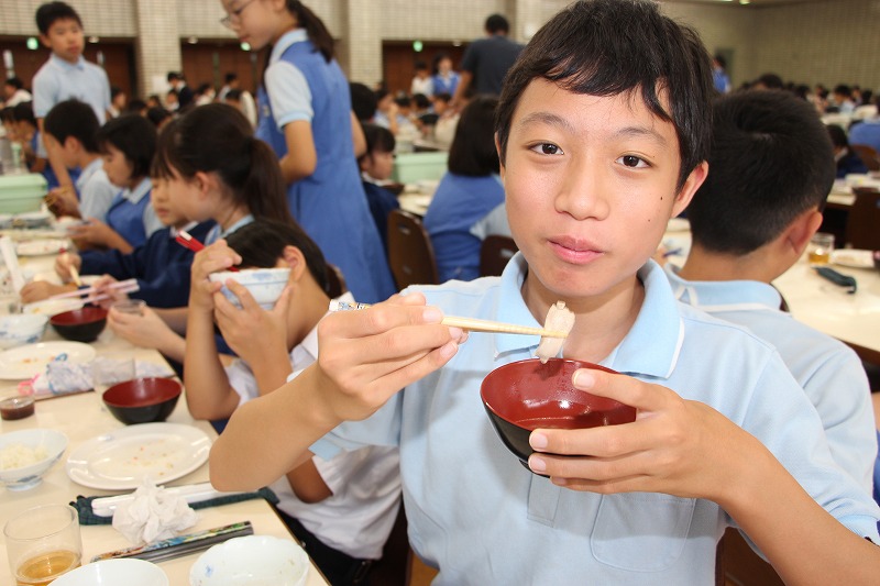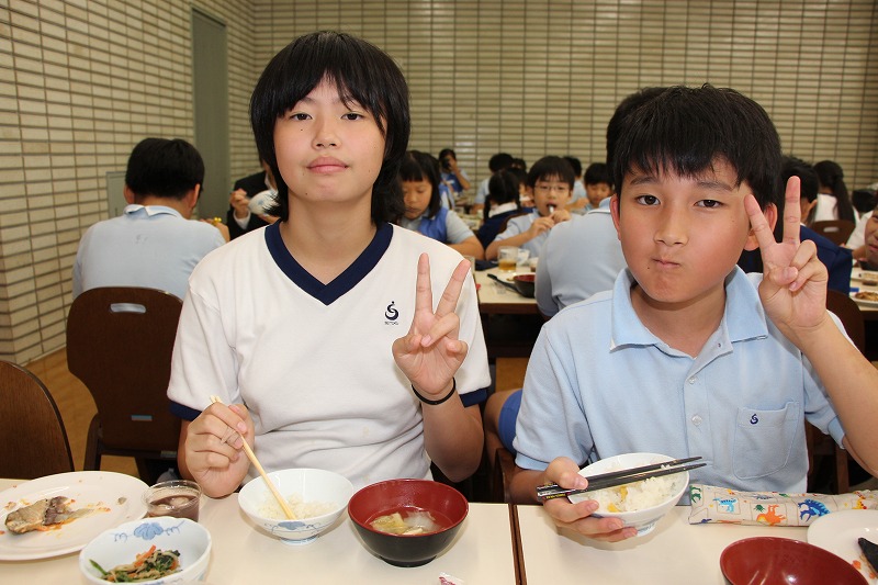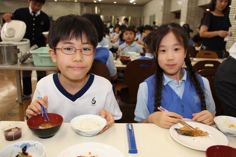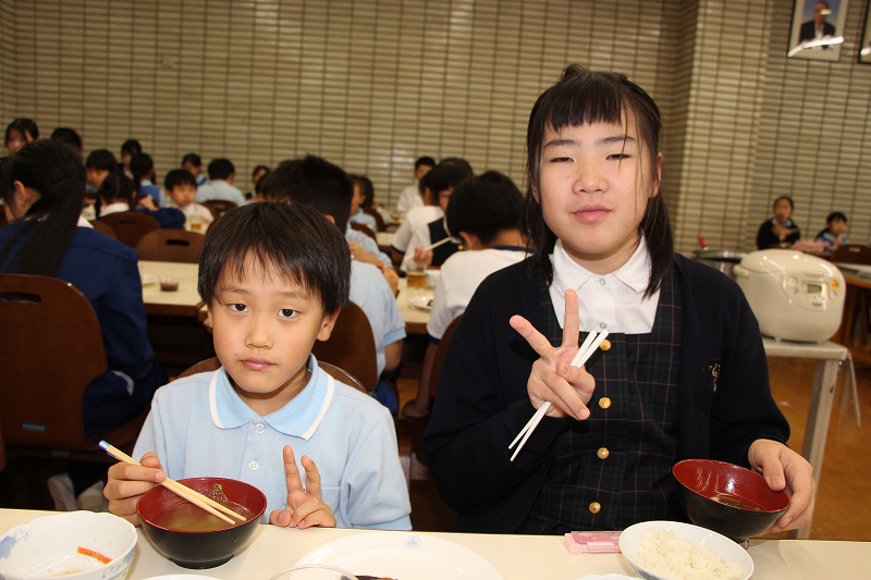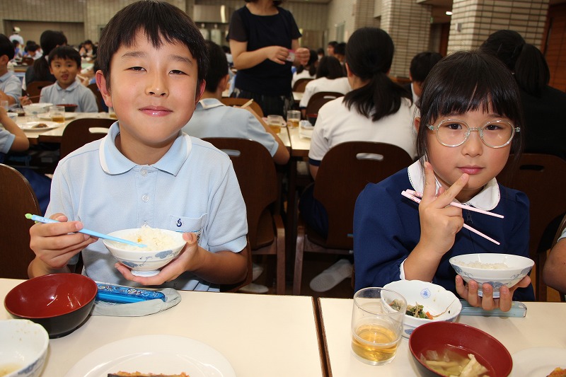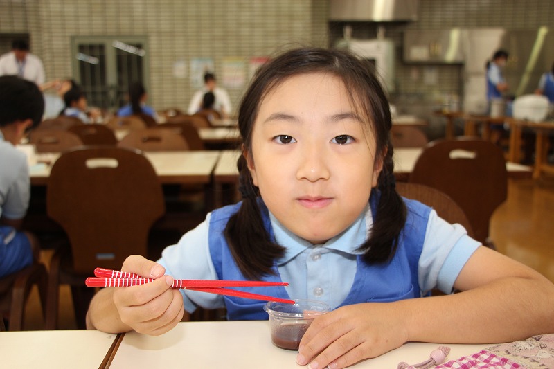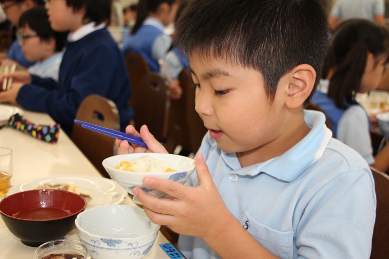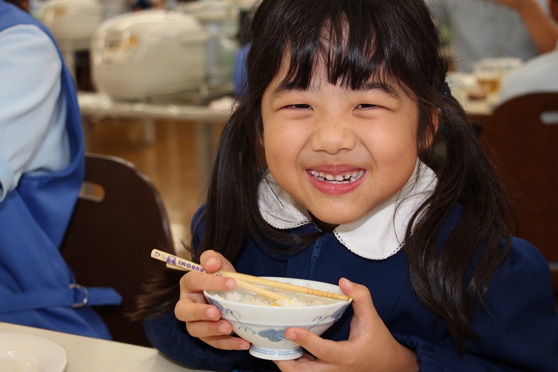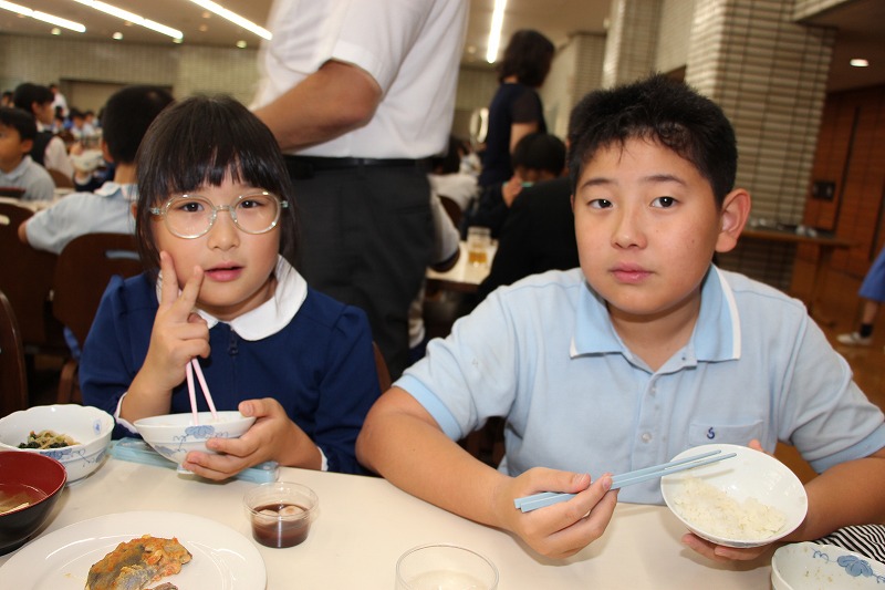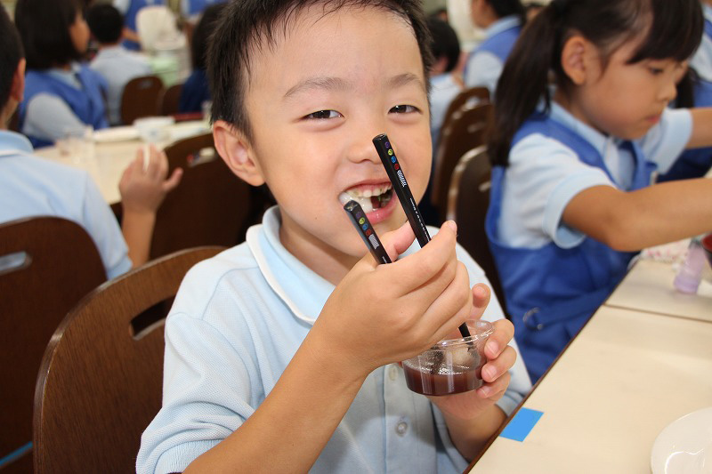 秋の紅葉をイメージした「鯵のもみじ焼き」、「月見団子」のかわりの「白玉ぜんざい」と並びますが、今日の主役は、やはり「栗ご飯」でしょう。高級感あふれる「栗ご飯」を、子どもたちは楽しみました。