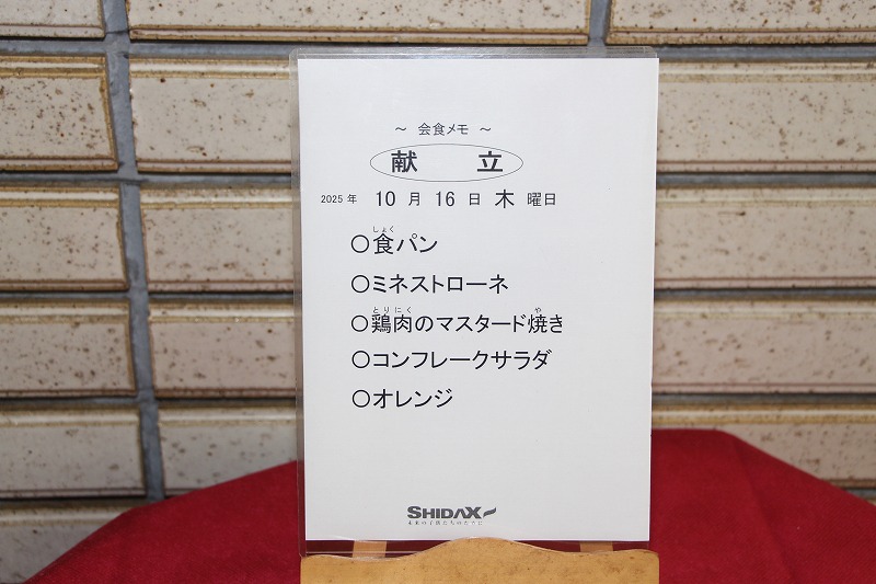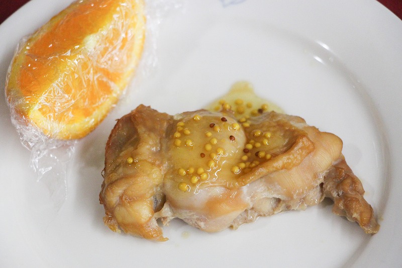 今日の会食メニューは、洋食好きな子どもが大喜び!ハニーマスタードソースの「鶏肉のマスタード焼き」でした。はちみつの効果でマスタードの辛みが抑えられ、マイルドで食べやすい味付けに仕上がっています。