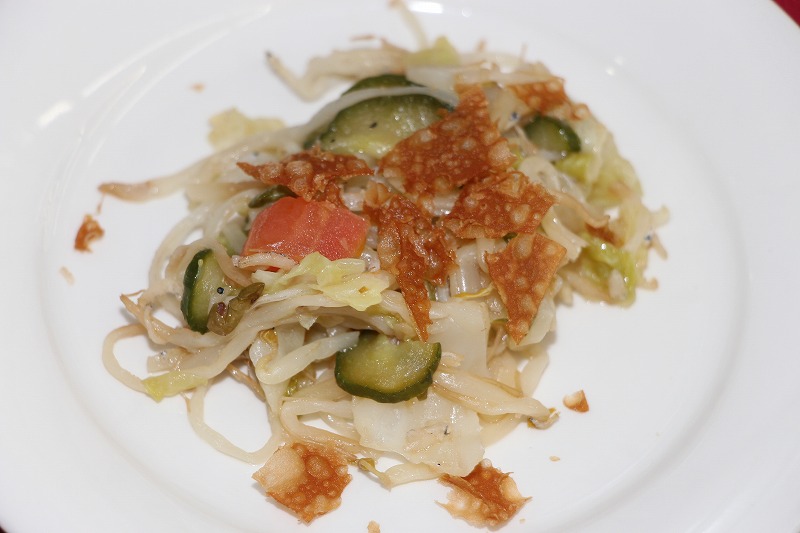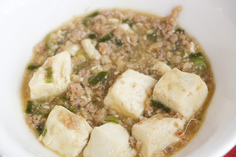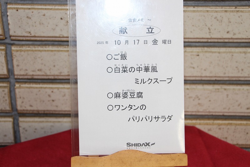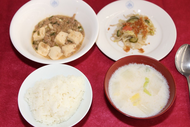 「今日は、マーボードーフだって!」「サラダは、ワンタンのパリパリサラダだって!」