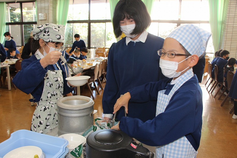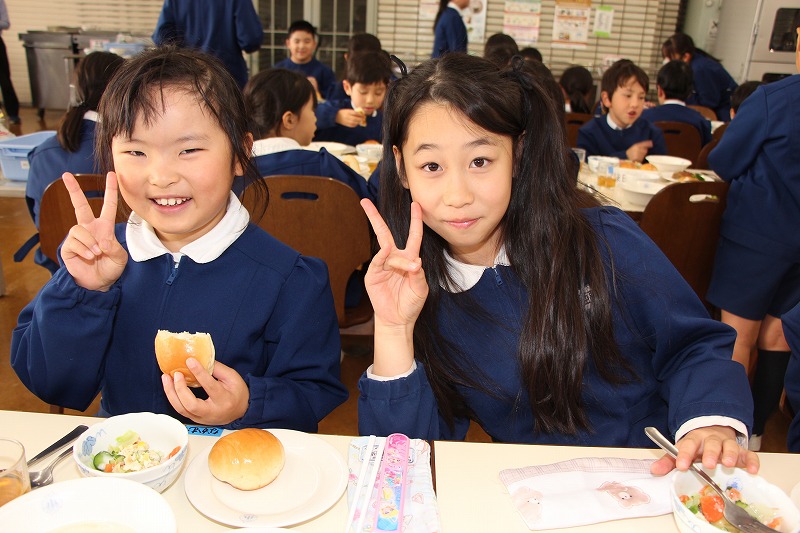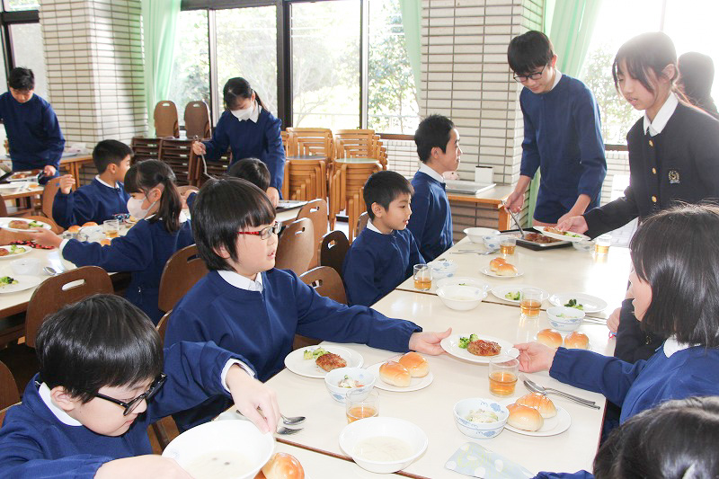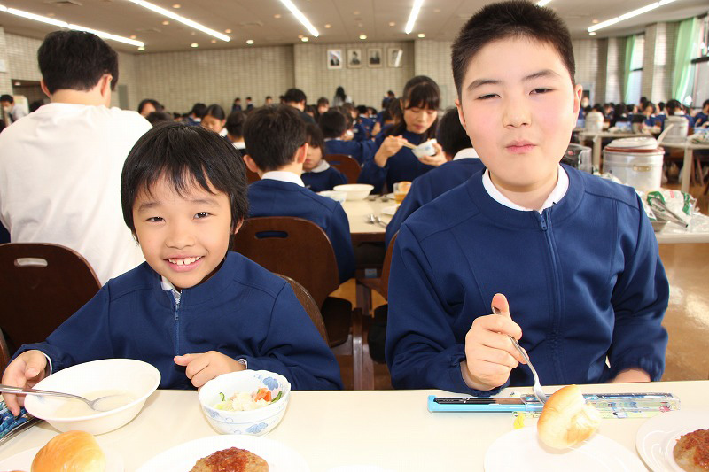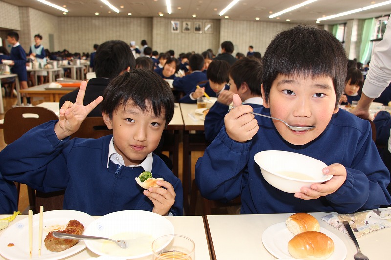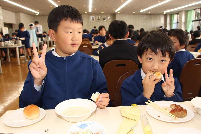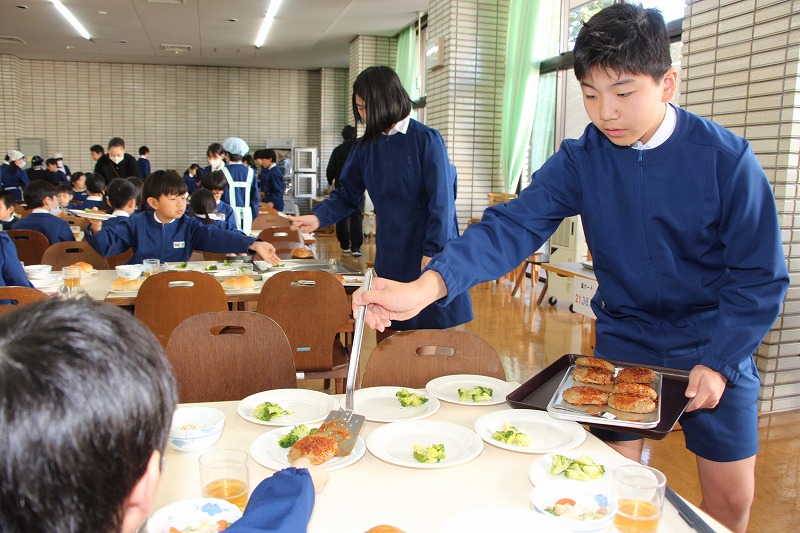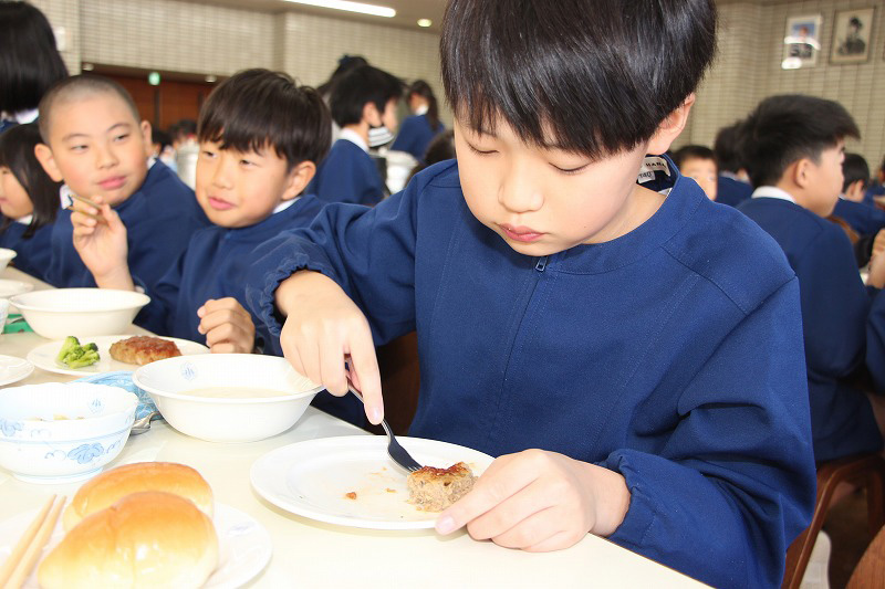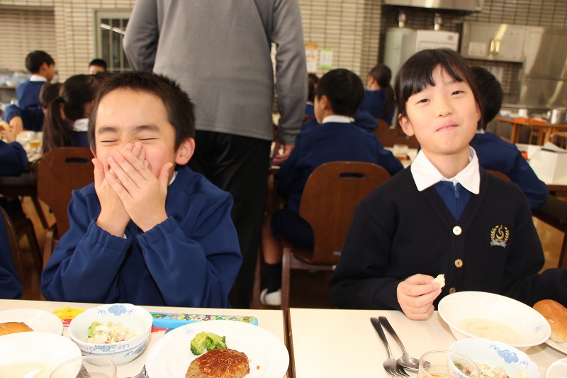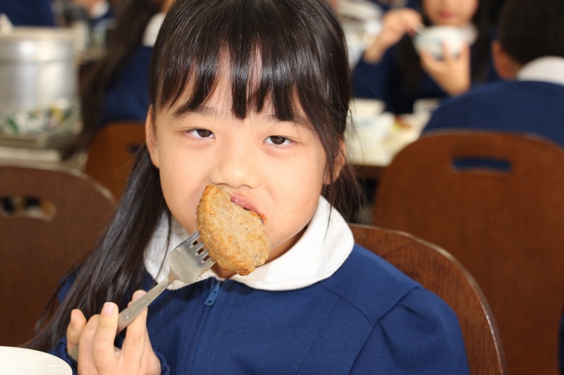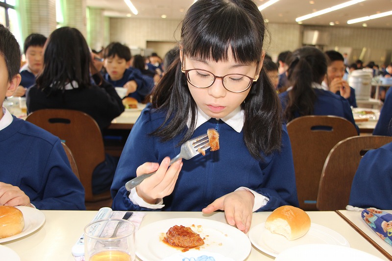 豪華な会食は、リクエスト献立と見まごう本格的な「ハンバーグ デミグラスソース」でした。高学年が温かいまま配膳してくれたおかげで、美味しさが格別。生徒たちは目を輝かせ、肉厚なハンバーグを頬張り、口いっぱいに広がる旨味に歓声を上げます。温かい冬日向(ふゆひなた)の下、洋食の華を心ゆくまで楽しむ「聖徳の子」たちの、満ち足りた幸福な笑顔があふれるひとときでした。