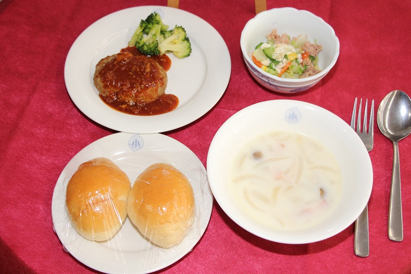 リクエスト献立と見まがうほどの豪華さ! 今日の会食は、本格的な「ハンバーグ デミグラスソース」でした。このような洋食を味わえる「聖徳の子」たちは、本当に幸せだと思います。高学年が温かいまま配膳してくれるので、より一層、 美味しくいただけます。