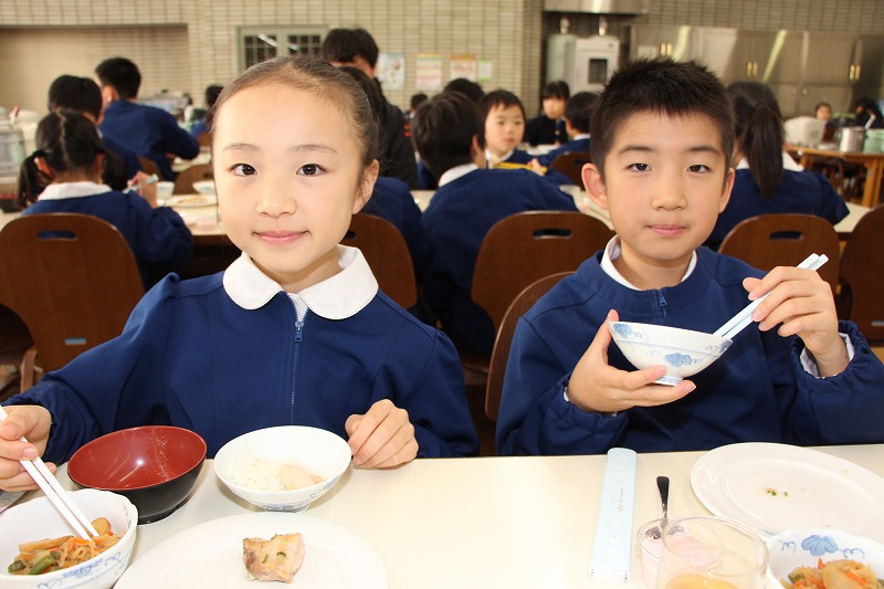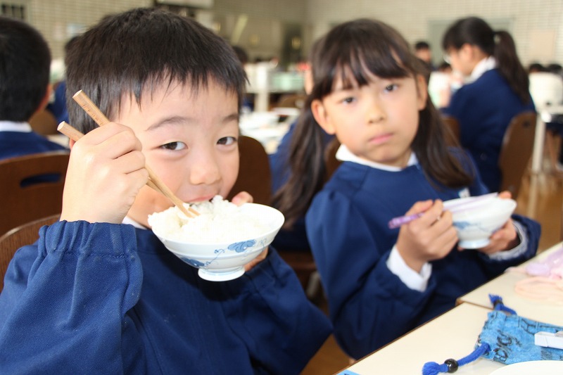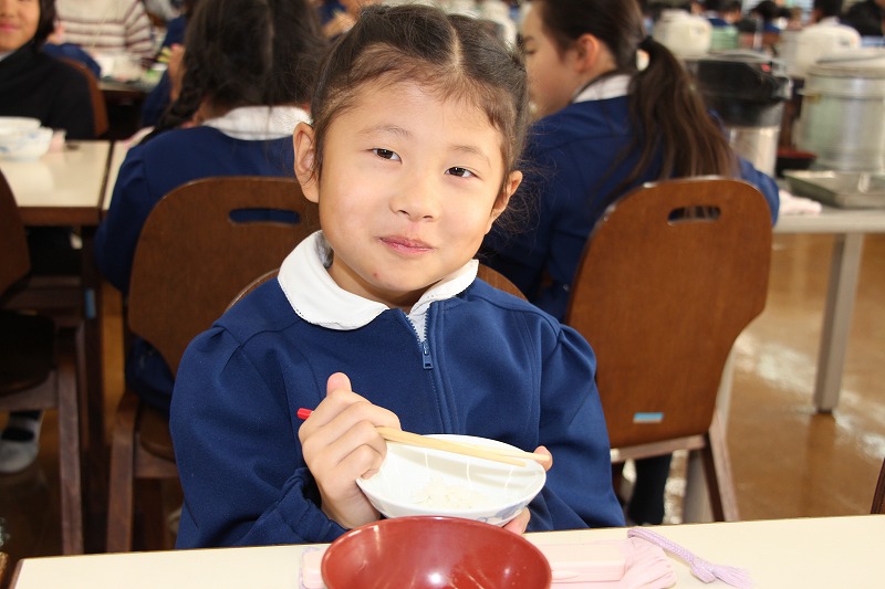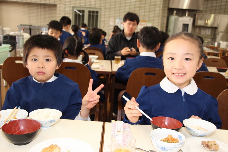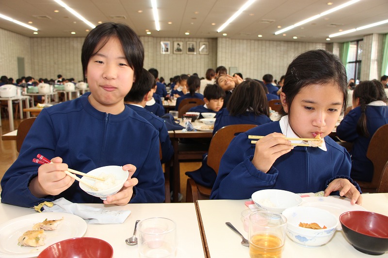 温カートから取り出された温かい香味焼きを頬張り、目を輝かせる「聖徳の子」たち。笑顔あふれる会食タイムです。
