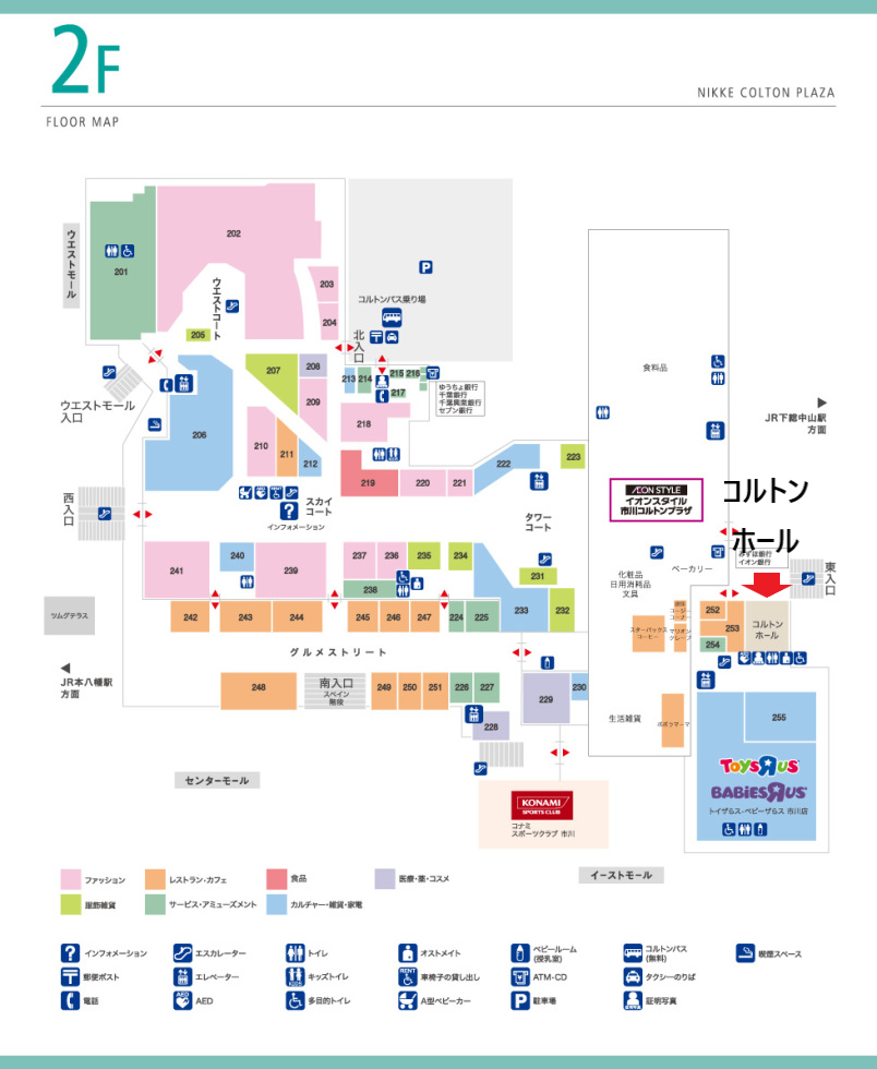 ■コルトンホール案内図※ニッケコルトンプラザ2階、東入口付近、バーガーキング隣り(駐車場は緑ゾーンが最寄り)